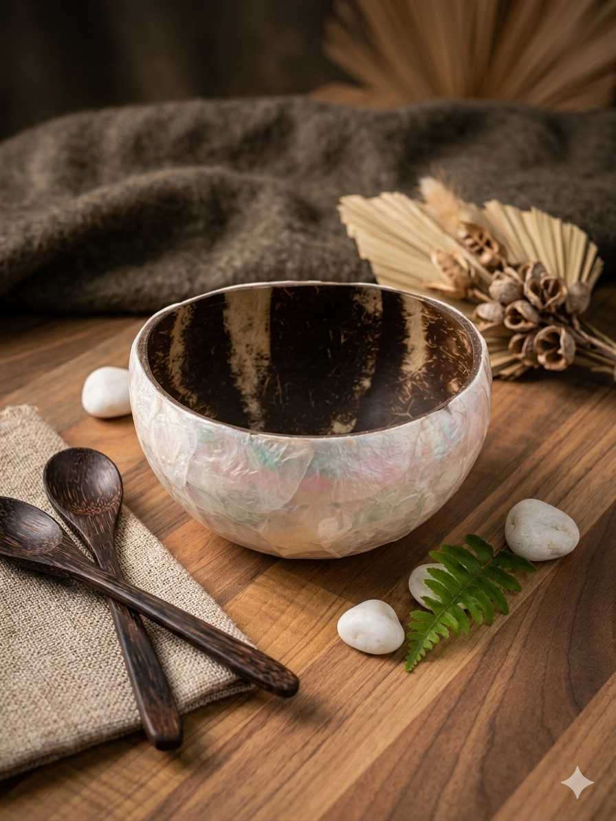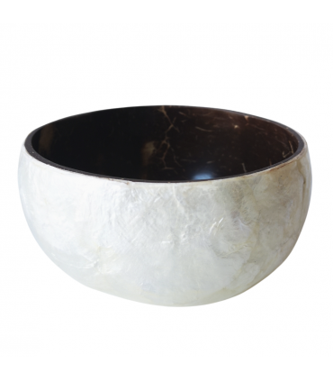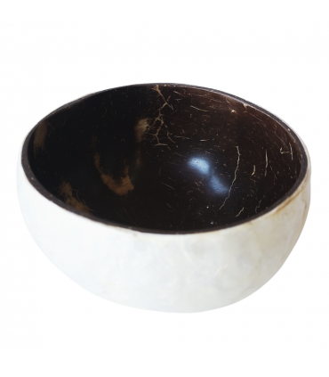 Cuenco de coco con detalles en nácar, de aproximadamente 14 cm de diámetro y 8 cm de altura.