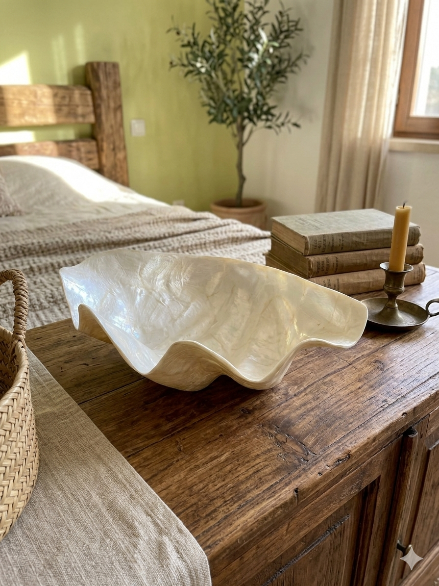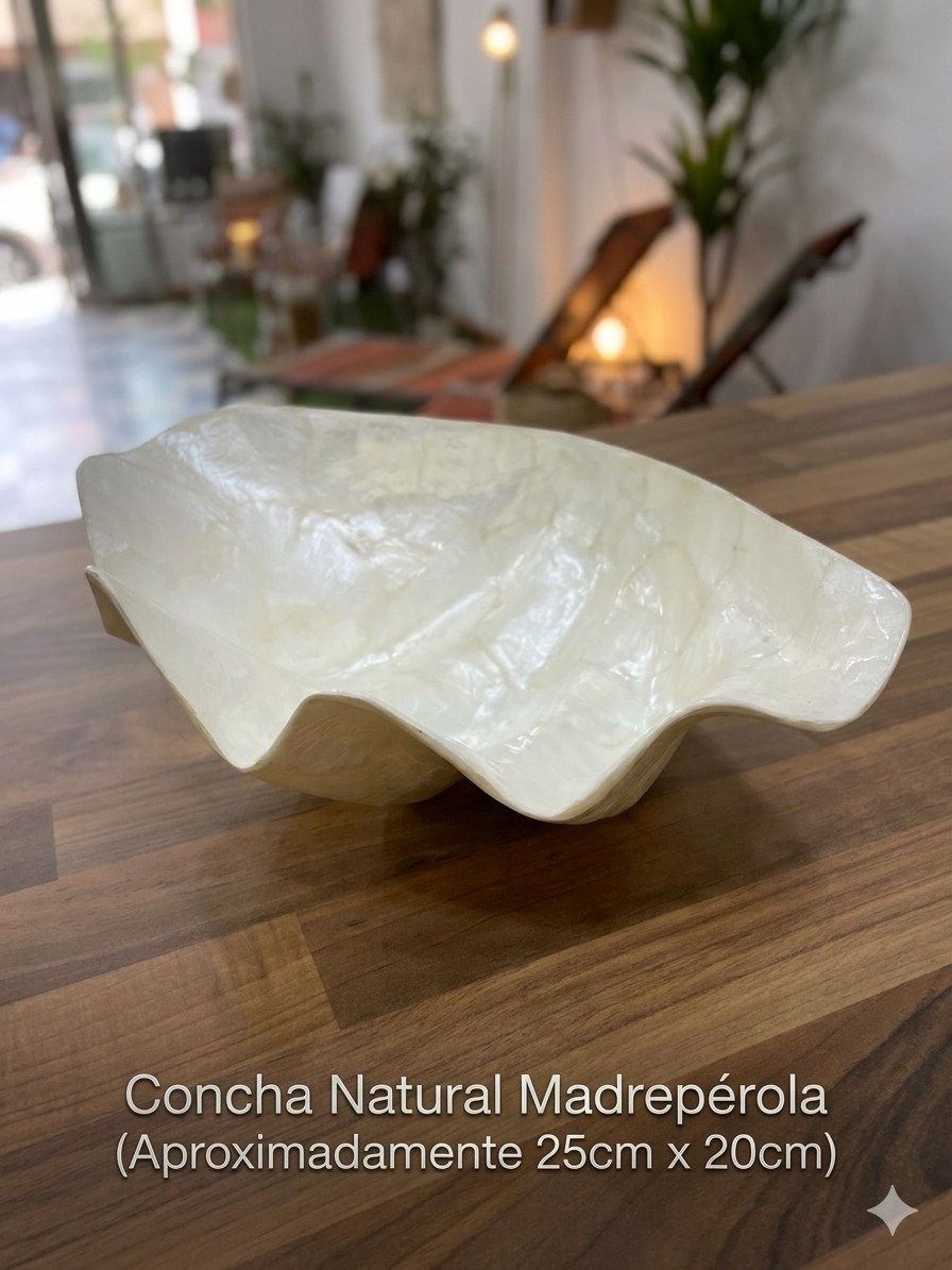 Bol artesanal decorado con láminas de nácar formando una concha, de aproximadamente 25x20x8 cm. Acabado en tono natural.