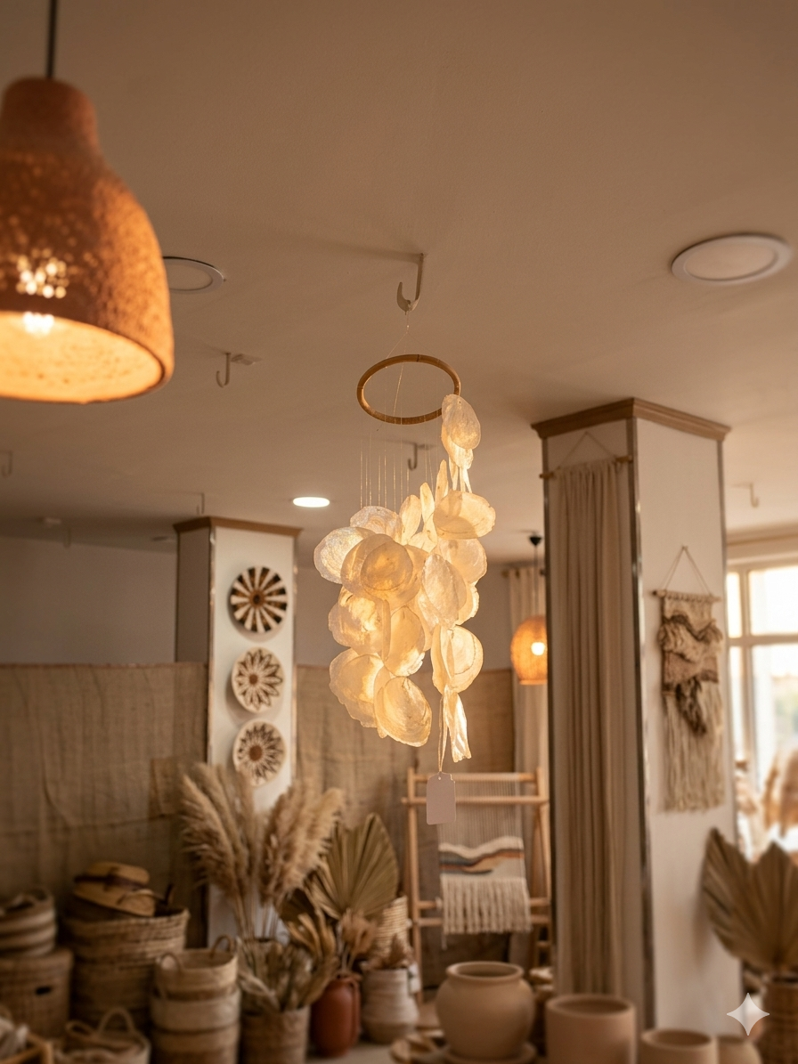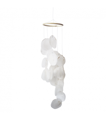 Móvil decorativo confeccionado artesanalmente con delicadas láminas de nácar, que reflejan la luz creando un efecto suave y relajante. Con un largo aproximado de 70 cm, es ideal para aportar un toque natural y elegante a cualquier espacio.