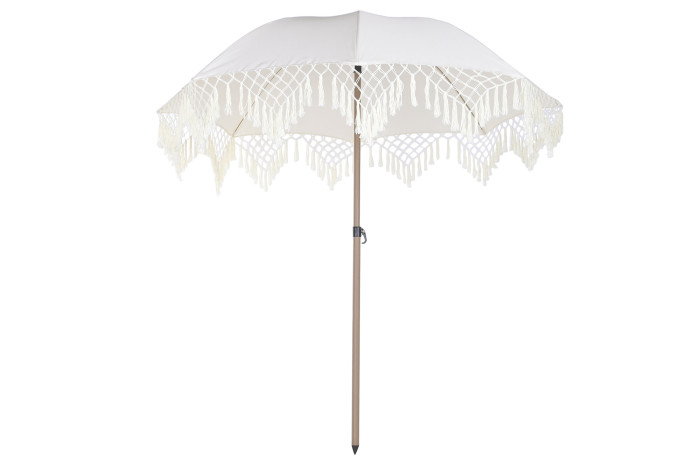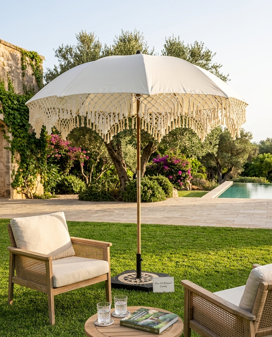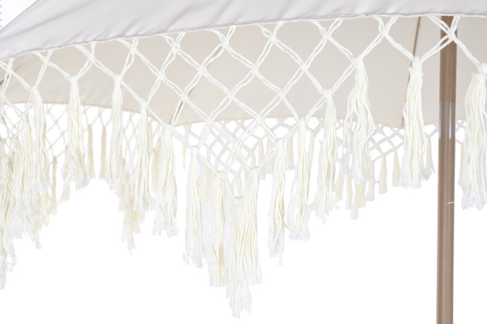 Incorpora flecos decorativos que aportan un estilo boho y relajado, perfecto para crear ambientes acogedores al aire libre. Además, cuenta con protección UV50, ayudando a reducir la exposición al sol.