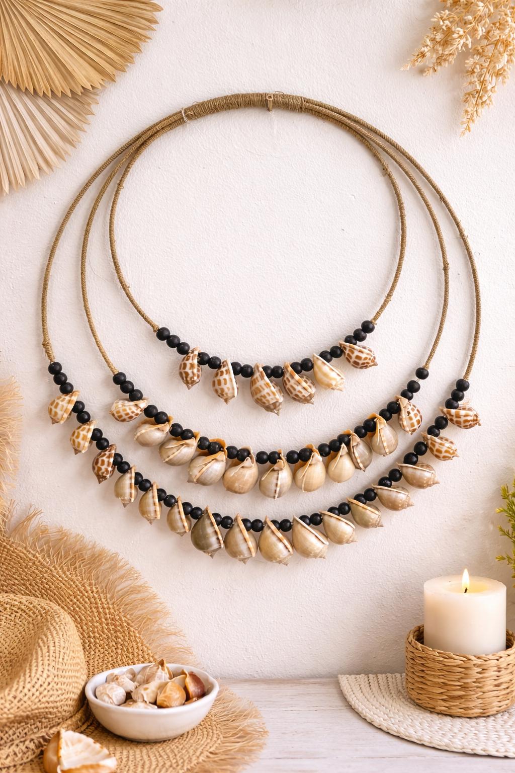 Este elegante adorno de pared de estilo boho está elaborado con materiales naturales que evocan la esencia del mar y la calma de los espacios mediterráneos. Compuesto por tres delicados arcos decorativos, combina conchas marinas cuidadosamente seleccionadas con cuentas en tonos neutros y negros, creando un contraste sofisticado y armonioso.